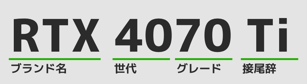 ぱっと見でGPUを判別する方法はあります。メーカーによって異なりますが、以下の表を確認してください。