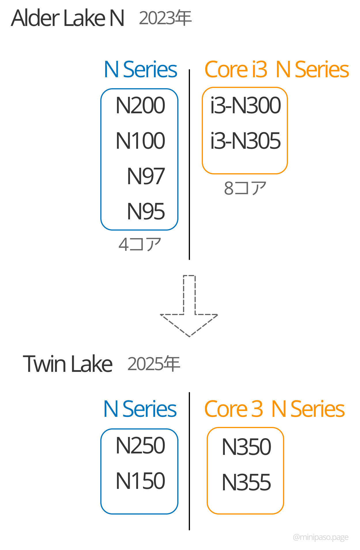 また、先ほど紹介したi3-N300 / i3-N305もそれぞれ後継品が出てきました。